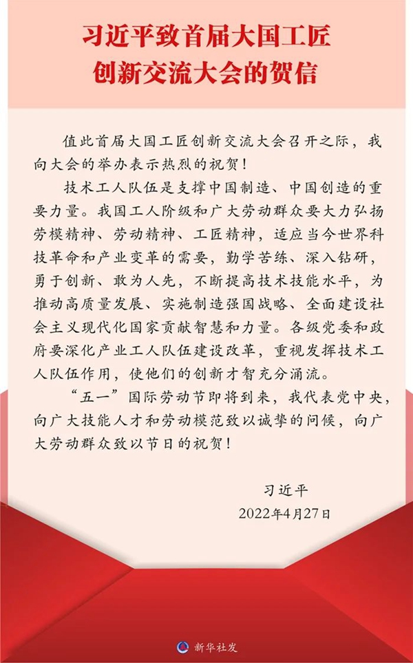 2022年4月27日,首届大国工匠创新交流大会在京开幕。习近平发来贺信,向大会的举办表示热烈的祝贺,并在“五一”国际劳动节到来之际,代表党中央向广大技能人才和劳动模范致以诚挚的问候,向广大劳动群众致以节日的祝贺。总书记说:
