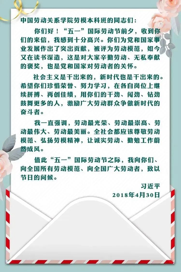 2018年4月30日,在“五一”国际劳动节来临之际,习近平总书记给中国劳动关系学院劳模本科班学员回信,他在回信中强调:
