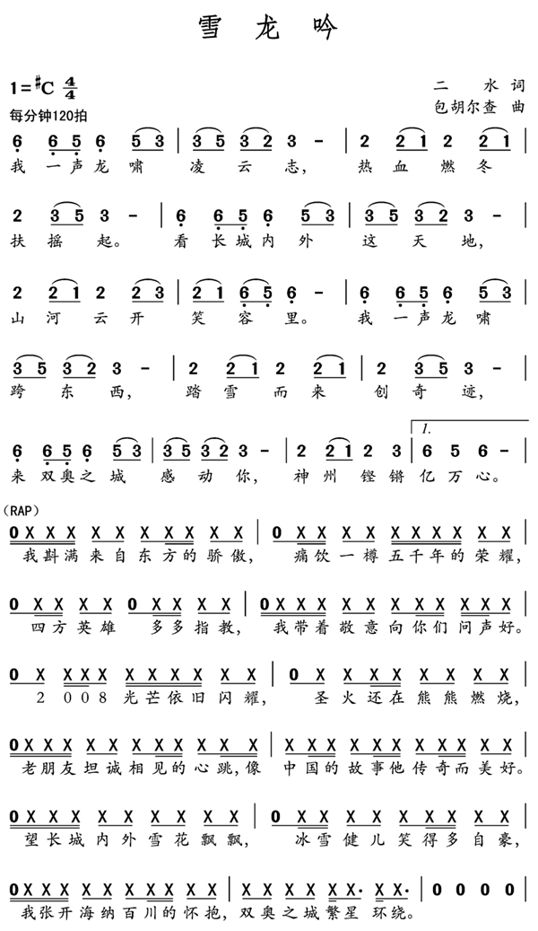 歌曲《雪龙吟》融合了多种音乐元素,形式新颖、特色鲜明。在极短的前奏后,直接以副歌开篇先声夺人,点明主题。接着用“中国风”的旋律和鼓点,衬托快节奏的中文说唱,直抒胸臆。之后又是一段相对抒情的演唱,与之前的风格形成反差,一张一弛、相辅相成。这首歌曲既生动地描绘出冰雪盛会的异彩纷呈,又讲述了中华文明恭谦有礼、热情好客的优良传统,同时也歌颂了不屈不挠、顽强拼搏的体育精神,表达了人们对冬奥会的热爱和期待,以及发自内心的民族自豪感。