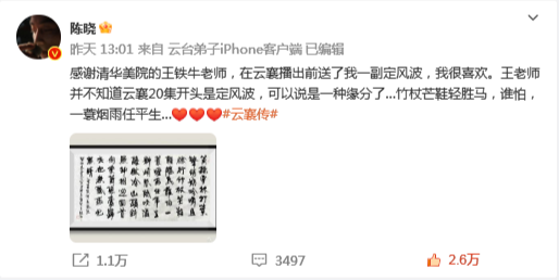 “云襄”的扮演者陈晓也在微博晒出,