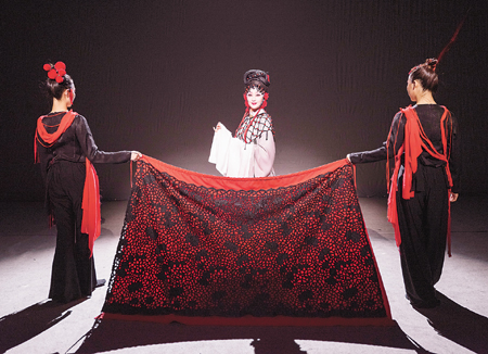 这部戏舞台呈现上风格化鲜明,体现出导演对这台戏的风格、架构和细节的有机把握。尤其是导演白爱莲、谭昀对剧中男、女舞者的作用进行了强化:舞者在剧中不仅表达情绪、营造氛围,而且在黑、红服饰色调的基础上,导演用一条长而醒目的红丝带,既象征贯穿剧情始终的意义,同时也在叙事过程中分隔场景,表现平行时空,体现出写意、灵动、实验性的艺术风格,不经意间彰显出对淮剧表现力边界的拓展。