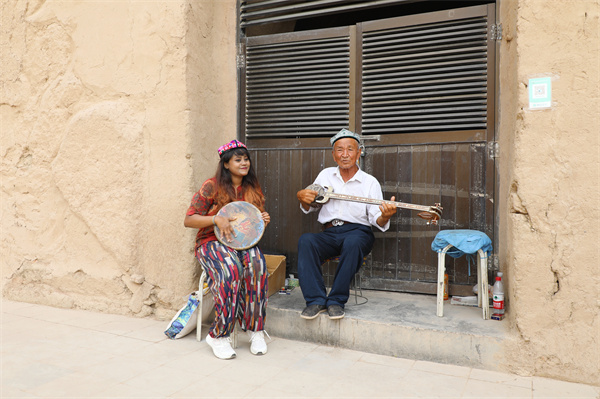 国外在华青年美术家同当地维吾尔族老人共同演奏手鼓和热瓦甫