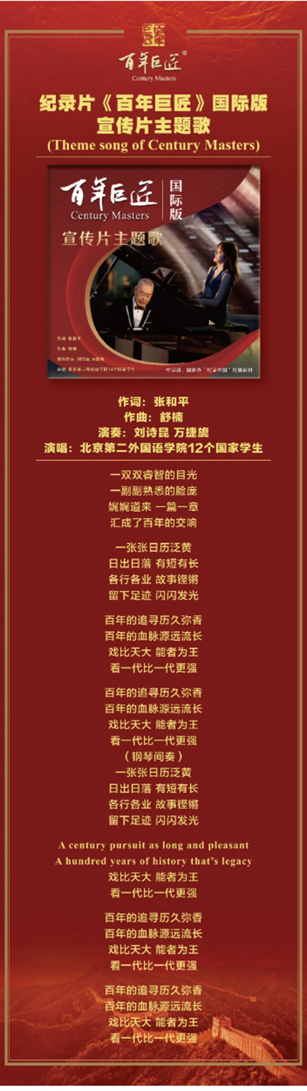 作为中宣部、国务院新闻办组织实施的“纪录中国”传播工程项目之一,《百年巨匠》国际版宣传片的主题歌由张和平作词,舒楠作曲,刘诗昆、万捷旎钢琴伴奏,北京第二外国语学院12个国家学生演唱。