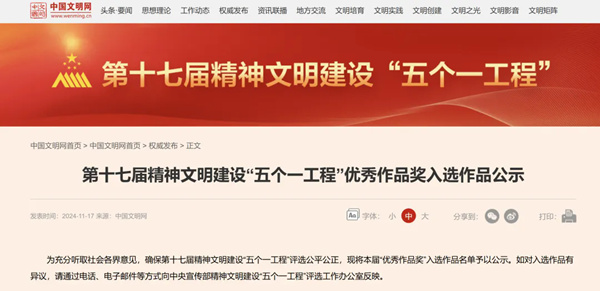 11月18日,中央宣传部精神文明建设“五个一工程”评选工作办公室印发《第十七届精神文明建设“五个一工程”优秀作品奖入选作品公示》的通知,公示了本届“优秀作品奖”入选作品名单。
