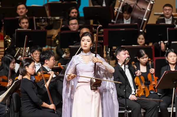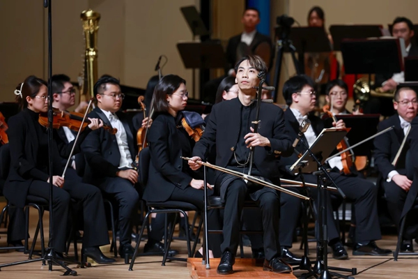 此次展演中,青年二胡演奏家马可带来的二胡协奏曲《巾帼》是由浙江音乐学院作曲与指挥系副主任,王云飞教授精心创作的,展现了花木兰的英勇与坚韧。在演奏呈现中,马可采用“站奏”的形式来诠释,这种演奏形式对演奏者而言存在一定挑战。由于二胡琴身是通过腰带与琴托和身体相连,在演奏形态方面,肢体的舒展程度与坐奏表演形式略有不同,并且在力量的把控、声音的传送以及音色的塑造上,都需要演奏者有意识的进行更多的调节。对马可来说,完成这次表演既是一次颇具难度的挑战,也是一次突破自我、展现独特艺术表达的机遇。