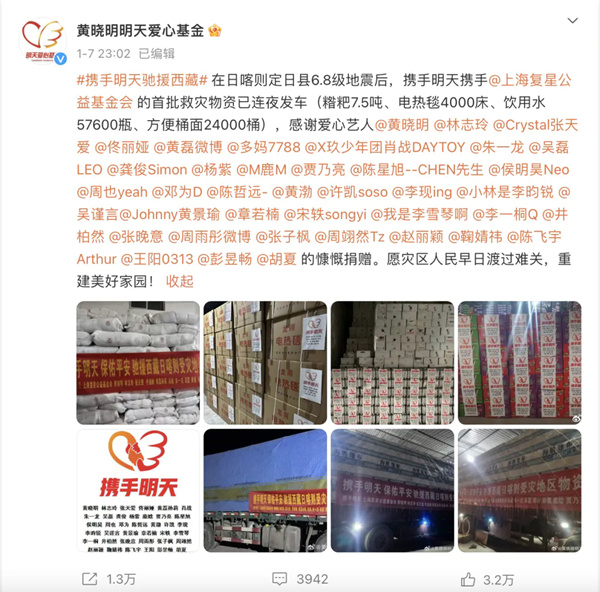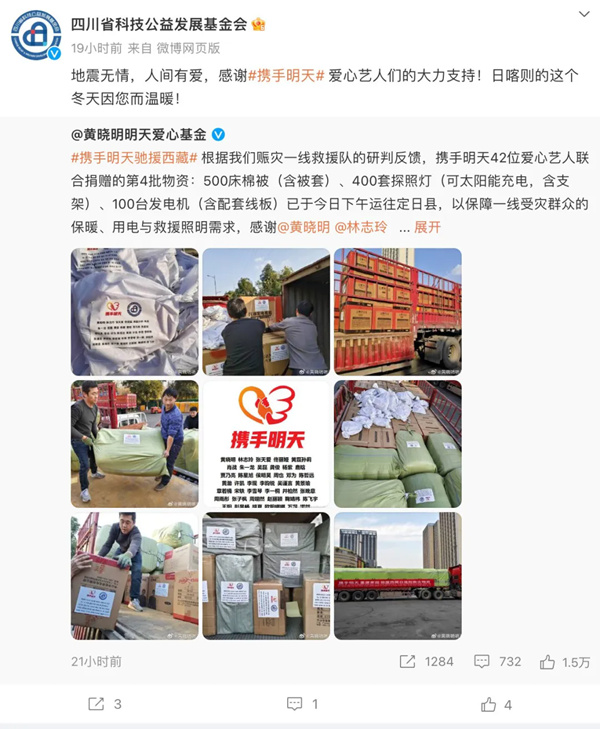 另据@四川省科技公益发展基金会 @黄晓明明天爱心基金 微博,林志玲、张天爱、佟丽娅、黄磊、孙莉、肖战等文艺工作者联合捐赠的物资于1月7日发车,并于1月8日顺利抵达西藏定日县。物资包括糌粑、电热毯、饮用水、方便桶面、帐篷、棉被等。