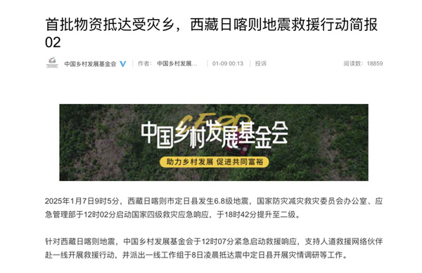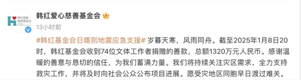 中国乡村发展基金会、四川省科技公益发展基金会、黄晓明明天爱心基金、韩红爱心慈善基金会等纷纷发文称,众多文艺工作者捐款捐物,用于受灾地区的紧急救援、灾后恢复重建等工作。 据@中国乡村发展基金会 微博,郑钦文、辛芷蕾、李晨等文体工作者陆续通过中国乡村发展基金会向受灾地区捐款捐物。《唐探1900》《哪吒之魔童闹海》《射雕英雄传:侠之大者》《熊出没·重启未来》《大奉打更人》等剧组也通过中国乡村发展基金会支持救援行动,同心抗震。