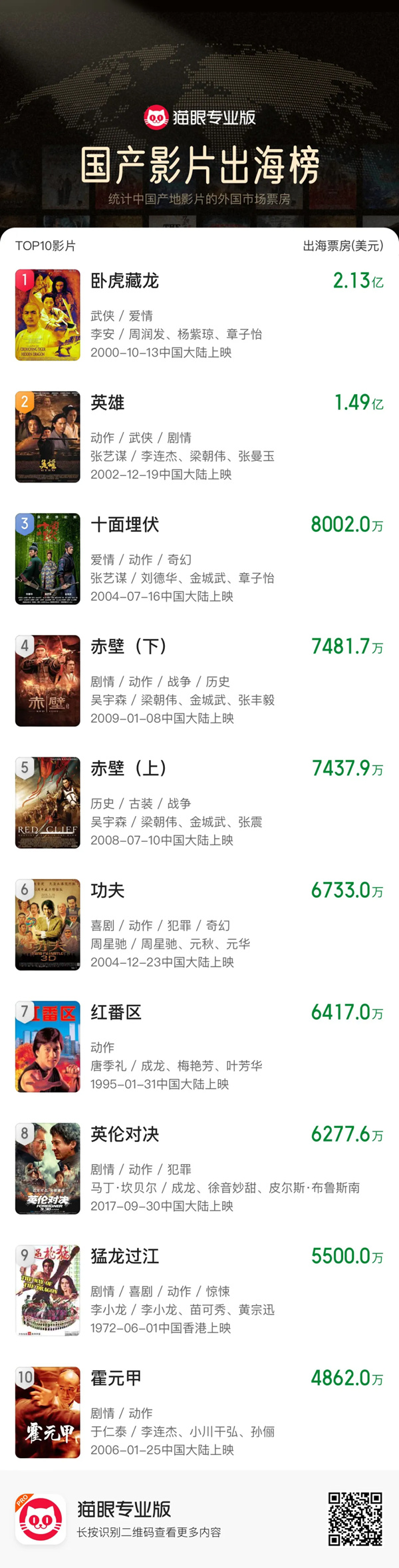 从“动作”到“动画”,《哪吒2》对中国电影建立自己的“出海方法论”有重要意义。在国产影片出海榜前20名中,几乎都是《卧虎藏龙》《英雄》《十面埋伏》《赤壁》《功夫》等讲述中国传统武侠故事、展现“中国功夫”独特动作美学、“武”出中国人精气神的影片。李小龙、成龙、李连杰、周星驰等电影人在好莱坞“打”出一片天,以浓烈的东方美学风格让中国电影在海外独树一帜,也让“中国人”和“中国功夫”在外国人对中国的文化印象中深刻绑定。