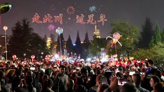 科技的赋能不止于线上。2025年羌年期间,北川新生广场的千架无人机表演惊艳全场:无人机在夜空中组成“羌年吉祥”“羊皮鼓”“羊角花”等图案,配合地面的3D投影,让古老碉楼“活”了起来——墙体上流转着羌族先祖耕作、狩猎的画面,羊皮鼓点与电子乐交织,传统与现代在此刻交融。“以前觉得非遗离我们很远,现在看到无人机表演,突然觉得羌年很酷。”来自成都的00后游客小李说。