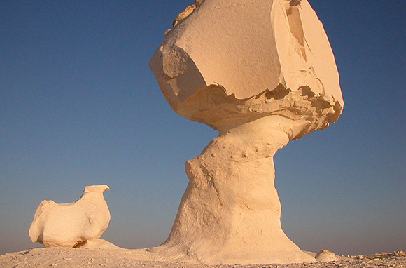 白色沙漠有一个和一般的沙漠不同的地方:这里有风力“雕刻”的岩石像。岩石像的形状从蘑菇到蟋蟀,形状多样,奇特万千。