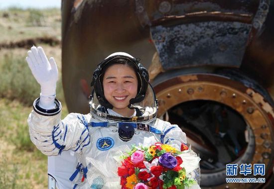 2012年6月29日,中国航天员刘洋出舱后挥手致意。