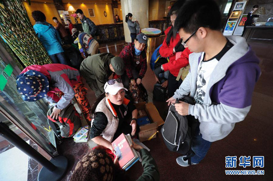 4月23日,“爱心背书客”志愿者把书装进背包准备出发前往乡村小学。