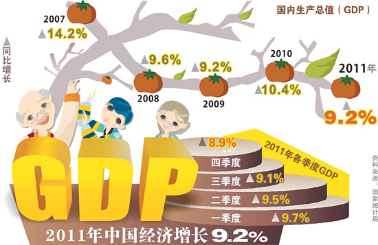 1月17日,国家统计局公布2011年主要宏观经济数据。数据显示,初步测算,2011年全年国内生产总值471564亿元,按可比价格计算,比上年增长9.2%。