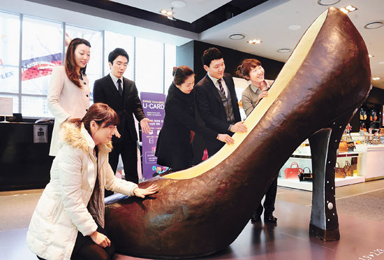 2月1日,韩国首尔现代百货店展出一只巨型巧克力高跟鞋。这一高跟鞋高两米,使用六十千克巧克力耗时十四天制成。为迎接即将到来的情人节,各商家纷纷推出巧克力产品。图为人们在韩国首尔现代百货店内观看巨型巧克力高跟鞋。