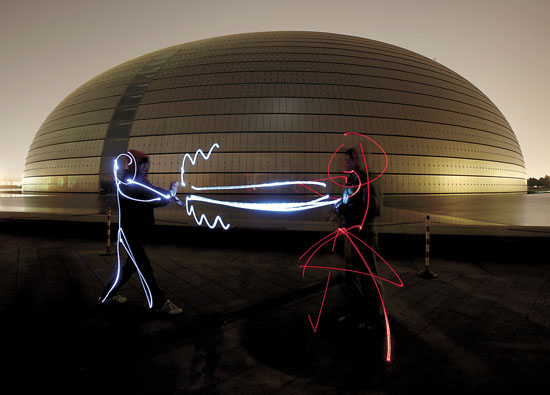 北京国家大剧院前,几名光绘爱好者在熄灯期间用LED灯绘出一对“情侣”。 新华社记者 沈伯韩 摄