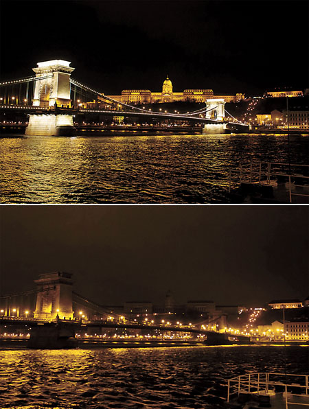 匈牙利布达佩斯,链子桥(前)和王宫(后)在熄灯前(上)和熄灯后的景色。 新华社发 弗尔季·奥蒂洛 摄