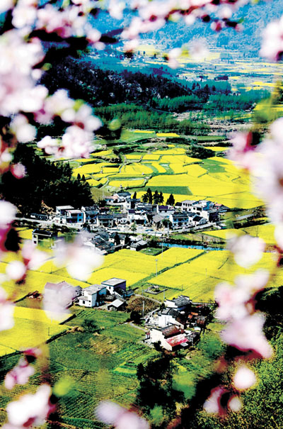 安徽皖南的黄山市革命老区柯村,一片片油菜花纵横错落、竞相绽放,与星罗棋布的徽派古民居构成一幅美丽迷人的金色图画。图为4月5日在皖南柯村革命老区拍摄的油菜花。