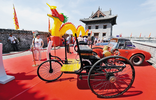 8月23日,由大同市人民政府、中国汽车工业国际合作总公司共同主办的中国(大同)国际汽车文化节在山西省大同市南城墙开幕。本届汽车文化节以“名城、名车、经典、时尚”为主题,共有40多个品牌约300辆展车参展。为期4天的汽车文化节将开展汽车特技表演、汽车模特大赛、汽车文化笔会等多项活动。图为观众在大同市南城墙上欣赏老爷车。新华社记者 詹彦 摄