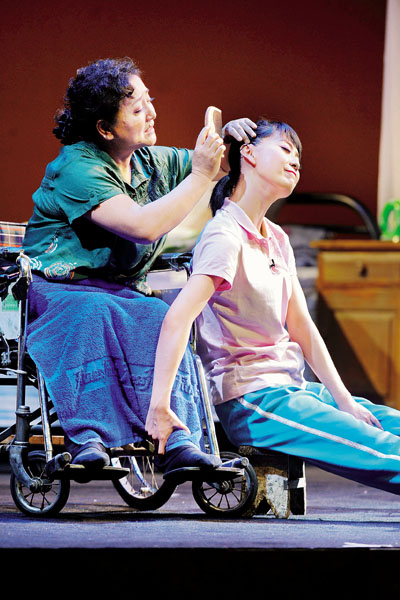 近日,根据第三届全国道德模范、“2011年感动中国”人物孟佩杰的事迹改编创作的话剧《美丽女孩》在山西省演艺中心首演。图为话剧《美丽女孩》中,李荣东饰演的养母刘芳英为韩静饰演的孟佩杰梳头。