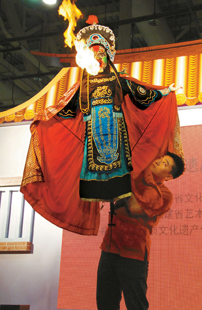 在刚刚落幕的第五届海峡两岸(厦门)文博会上,来自福建漳州木偶剧团的梁师傅,为厦门的观众表演木偶川剧变脸和喷火。