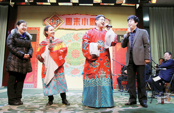 11月4日,北京迎来一场雨夹雪,但几十位中外记者却在十八大新闻中心的精心组织下一大早就兴致勃勃地赶赴河北省霸州市参观采访。记者们先后来到霸州市华夏民家收藏馆、李少春大剧院、益津书院、中华戏曲大观园等地。霸州浓郁的文化氛围和日臻完善的公共文化服务体系触动了在场的每一位记者。图为中外记者跟当地艺术家学习京剧唱腔,深刻体验中国传统文化的魅力。