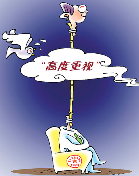 《人民日报》近日在读者来信版向网友征集“你最反感的官话套话”,“高度重视”成了头号选项。的确,许多个“高度重视”,只是徒有“高度”,却往往并不紧密贴合百姓意愿的实际;口称“重视”,偏偏只闻雷声不见雨点。这类“官话宣言”、“套话做秀”,其实对社会的实质进步毫无价值。有道是:官话套话太常见,“高度重视”成笑谈;只盼公仆干实事,乐为百姓多解难。