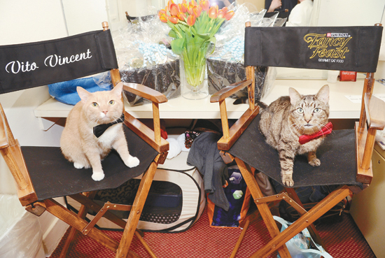 3月20日,在美国纽约,两只在百老汇新版舞台剧《蒂凡尼的早餐》中出演的“猫演员”维托·文森特(左)与切西在化妆室中接受拍照。
