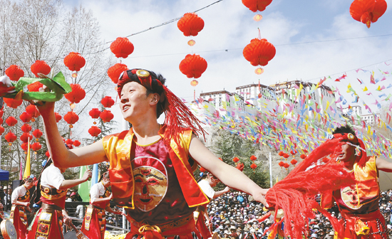 3月28日,西藏各地举行活动,庆祝西藏百万农奴解放54周年。图为农民艺术团演员在拉萨街头表演《欢腾的热巴》。
