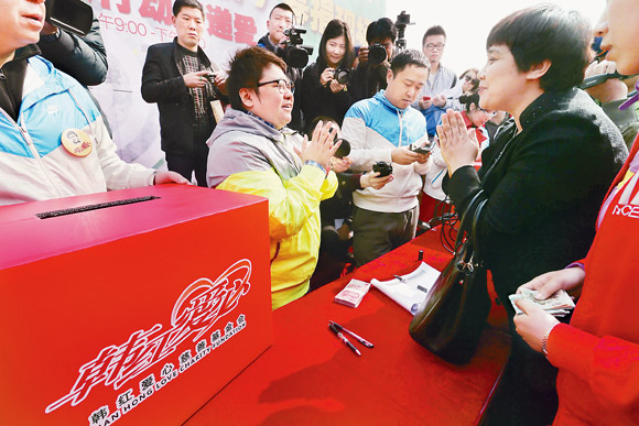 4月21日,韩红和韩红爱心基金工作人员在北京鸟巢搭台募捐,为四川雅安地震灾区助力。中新社发 李学仕 摄