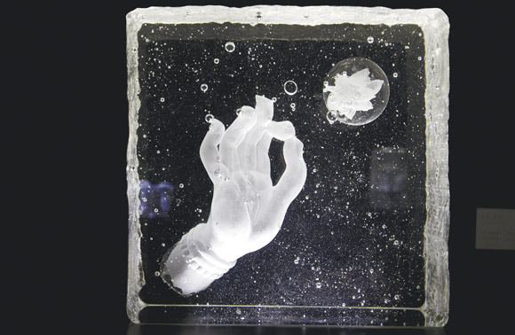 4月23日,“琉璃之人间探索——杨惠姗、张毅联展”亮相中国美术馆。展品包括杨惠姗的“一朵中国琉璃花”“无相无无相”“更见菩提”和张毅的“焰心禅心”“自在”等5大系列近50件新作。图为联展上的琉璃作品《菩提花开》。