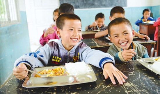 日前,贵州省黔南布依族苗族自治州龙里县湾寨乡石头村的布依族孩子在吃营养餐。国家实施的营养餐计划让贵州山区的孩子吃上了热腾腾的饭菜,让龙里县边远山区的孩子不再忍饥受饿。