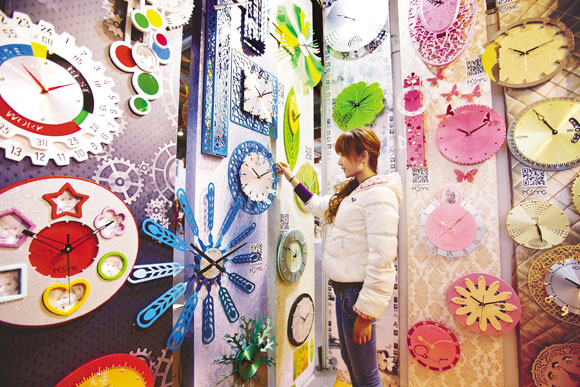 3月13日, 2014年中国·北京国际礼品、赠品及家庭用品(春季)展览会在北京中国国际展览中心开幕。图为观众在礼品展上参观各式创意钟表。新华社发 赵冰 摄
