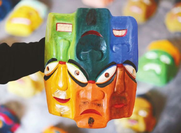 傩面具是傩文化中傩舞、傩祭、傩戏中使用的道具。傩面具种类众多,造型各异,粗犷朴拙、庄典华丽。图为湖北省恩施土家族苗族自治州的民间艺术家、土家傩戏大师、傩面具制作传承人汪儒斌3月16日展示作品“南斗六星” 。