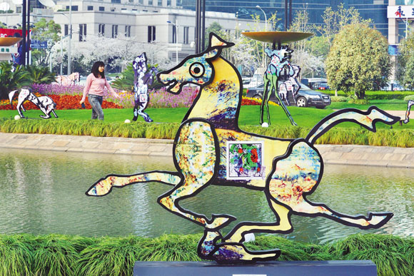“万马奔腾中国梦——2014微彩绘新艺术实验展”近日亮相上海陆家嘴中心绿地公园。由108位知名艺术家、设计师及数十家艺术机构联合推出108匹装置艺术马作品,全新呈现了“微彩绘”这一最新艺术表现形式和“彩绘码”等移动互联网技术。观众可用智能手机扫描实现互联网的链接与互动。图为市民和游客在上海陆家嘴中心绿地参观体验。