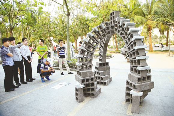 3月31日,首届“阳光海岛”国际建筑竞赛——砌块空间构成大赛获奖作品在海南大学校园内展出。大赛吸引来自中国、美国、英国、蒙古国等国家54个团队的59个作品参与角逐,经过结构专家、建筑师的评选,最后14支团队的作品脱颖而出。 新华社发