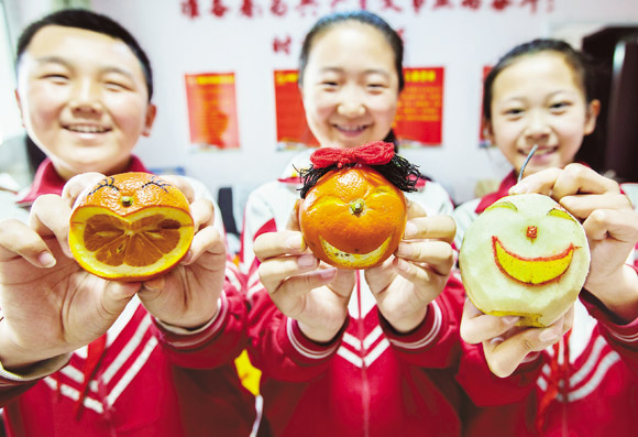 5月7日,呼和浩特市玉泉区小召小学的学生制作“笑脸橙子”,迎接5月8日“世界微笑日”的到来。