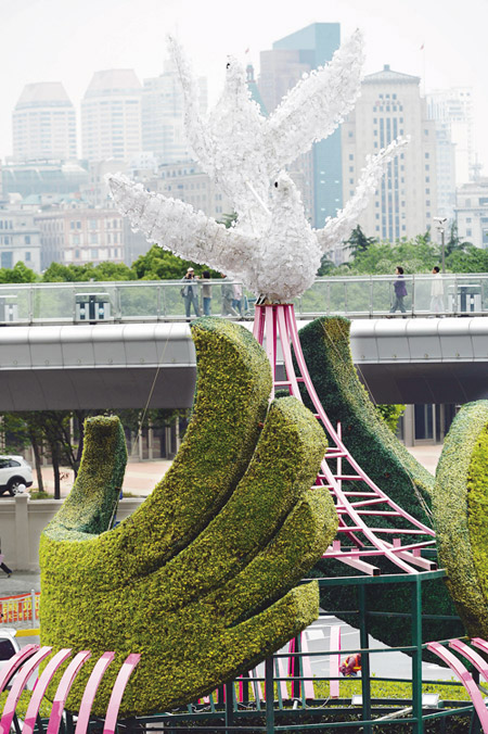 亚洲相互协作与信任措施会议第四次峰会5月20日至21日在中国上海举行。“和平鸽”主题花坛近日在亚信峰会会场之一 ——上海国际会议中心附近亮相。