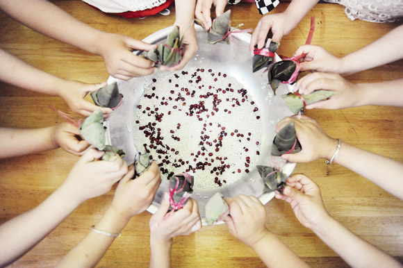 5月26日,浙江省临安市天松幼儿园开设“学习俗,迎端午”特色手工劳作课程,老师们手把手地指导小朋友包粽子、缝制香囊,在充满乐趣的体验活动中,传授端午节的传统习俗。图为小朋友在展示自己包的粽子。