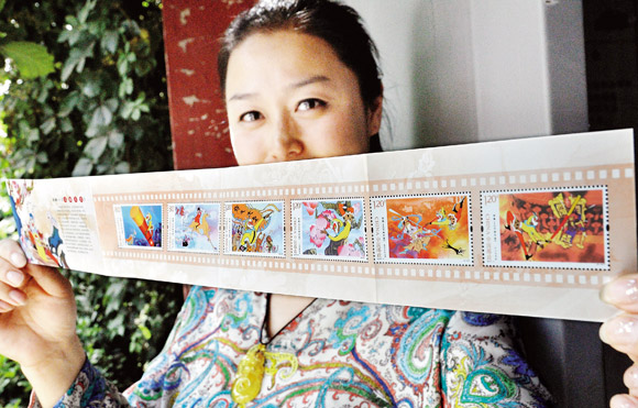 中国邮政于6月1日发行首套加载增强现实技术邮票《动画——〈大闹天宫〉》特种邮票,该邮票1套6枚,图案名称分别为龙宫夺宝、官封弼马温、自封齐天大圣、大闹蟠桃园、恶斗天兵天将、打上灵霄殿,同时发行小本票一本。用户通过手机等终端,下载安装应用程序后(可扫描二维码到下载界面),扫描邮票即可观赏《大闹天宫》动画片的片段;还可开启软件中的互动游戏,和孙悟空一起拍照。图为工作人员展示《动画——〈大闹天宫〉》特种邮票小本票。