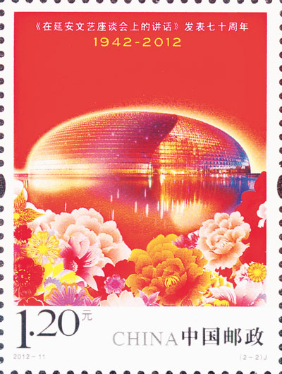 由中国邮政发行的《〈在延安文艺座谈会上的讲话〉发表70周年》纪念邮票今天面世。在中国文联、中国美协协助下,中国邮政邀请邮票设计专家几易其稿,最终设计图稿层次分明、颜色通透;印制采用影写版,并使用了异形齿孔、防伪油墨、防伪纸张、荧光喷码等防伪技术,具有较高的观赏和收藏价值。