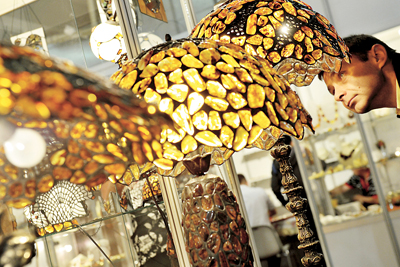 9月8日,在波兰格但斯克举行的第12届国际琥珀博览会上,由Amber Light工作室制作的琥珀灯正在展出。来自波兰国内外的超过120家参展商参与本届博览会。琥珀,作为一种产自波罗的海的树脂化石,自古以来一直被广泛交易。 新华社/EPA欧新 POLAND OUT