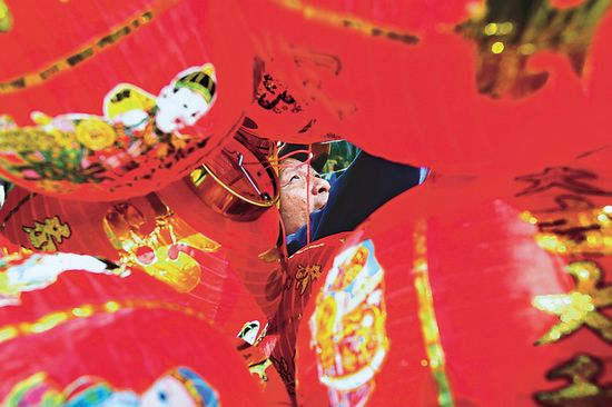 4. 菲律宾首都马尼拉的街道上,工人正在挂中国灯笼。新华社发 鲁埃勒·乌马利 摄