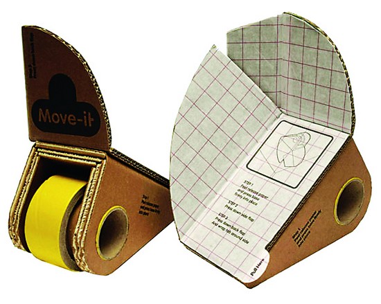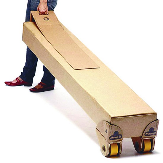 小拖车的材料是废弃的纸箱,利用纸箱硬纸板进行简单的组合,再将两个轮子放在箱子的两旁即可完成一个拖车,能运送20多公斤的货物。