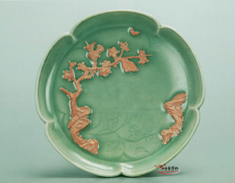 盘浅腹,圈足矮小,形制为元代流行样式,但作五个花口甚少见,一般都是六出花口。内足在釉上堆贴梅树及月亮,呈红褐色,树下方刻水纹及梅月倒影。釉呈梅子青色,青翠欲滴,温润如玉。此盘采用的堆塑修饰技巧也达到了很高水平。“堆塑”是一种陶瓷修饰技法,即将模印或雕塑成的立体状纹饰贴附在坯上,然后烧制而成。由于料中含有一定量的氧化铁,在烧成后冷却阶段经过两次氧化,纹饰表面呈紫红色,在青釉的衬托下,色彩鲜艳夺目,取得很好的修饰效果。这一装饰手法在元代比较流行,到了明代则比较少见。从盘底堆饰的梅枝形状、月亮及淡淡的梅月倒影等整个构思来看,则取意于北宋诗人林逋《山园小梅》中的诗句:“疏影横斜水清浅,暗香浮动月黄昏。”