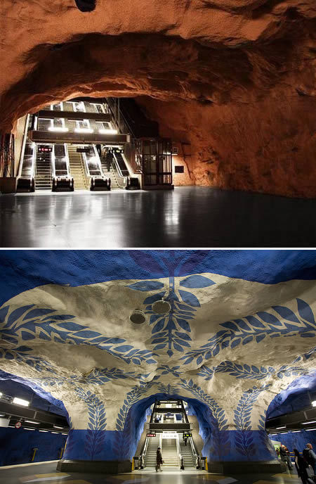 斯德哥尔摩地铁(瑞典):为了让旅客忘记他们是在地下旅行,地铁站通常都非常干净,在设计上大都采用现代主义色彩。而在瑞典的斯德哥尔摩地铁站,情况就不是这样的:几个地铁站由磐石构成,并留下如洞穴状的“天花板”。这里是古代和现代的结合,“洞穴壁画”成了点睛之作。