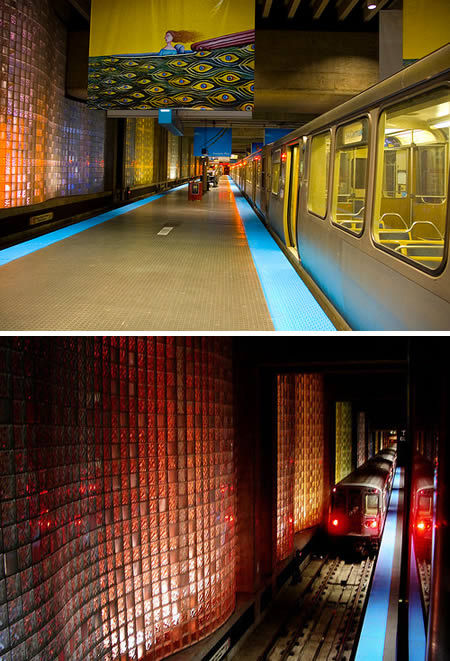 芝加哥的奥黑尔地铁站(美国):美国芝加哥的奥黑尔站建于1984年,从站台上可以看到机场候机楼。玻璃块组成的弧形侧壁以及不同的背景颜色,照亮了站台并且吸收了站台的声音。在站台尽头是楼梯和自动扶梯,上升并通过一个模仿飞机外形的灰色金属外墙,可以让旅客达到检票口以及到达机场出口。