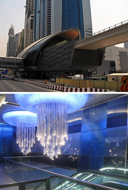 迪拜地铁站(阿联酋):迪拜地铁站结合了传统和现代的设计风格。以贝壳的外形为模型,室内设计描绘了水、空气、土和火等自然元素。