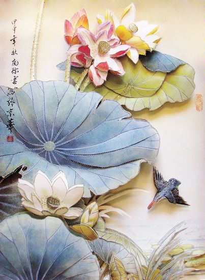 6.拼贴:从底层到上层将部件黏贴进画面。不同层次间的距离取决于胶粒厚度,在胶的厚度无法达到要求时,可以用泡沫板帮助垫高,过于纤细部件可用细铁丝黏贴在其背后以帮助固定。