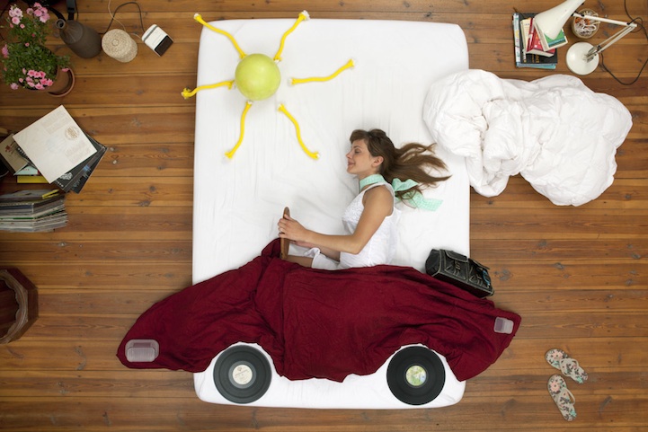 他请来一名普通的美丽女子,作为这组作品中的主角。他用常见的家居用品,比如被子、领带、袜子、唱片等摆放成各种梦境中的形象,再让这名女子躺在床上,摆着在梦境中天真活泼的姿势,然后将这些甜美的梦境用相机记录下来,展示给所有读者。