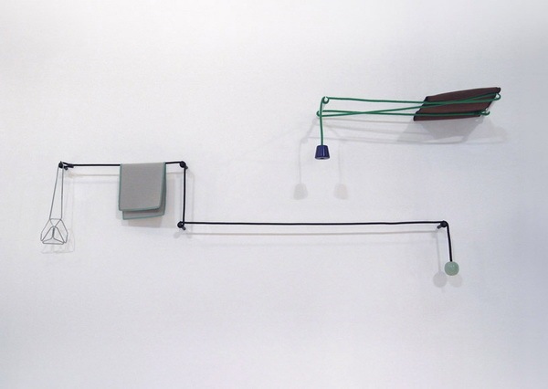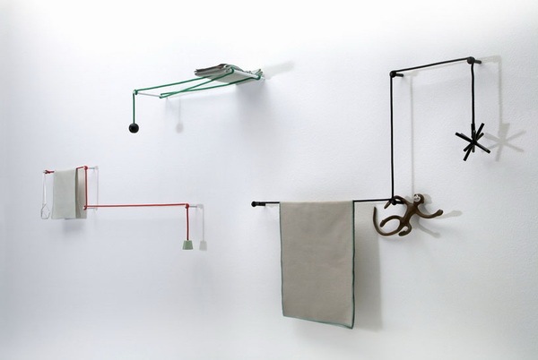 日本设计师hiroomi tahara设计的一款有趣的毛巾架。摒弃以往同类产品固定的框架结构towel hanger更加具有随意性,简单的三部分:绳子、配重、固定杆构成了towel hanger的重要组成部件,你可以根据需要或者心情随意安排和组合它们,在使用上给予了人们极大的想象空间。